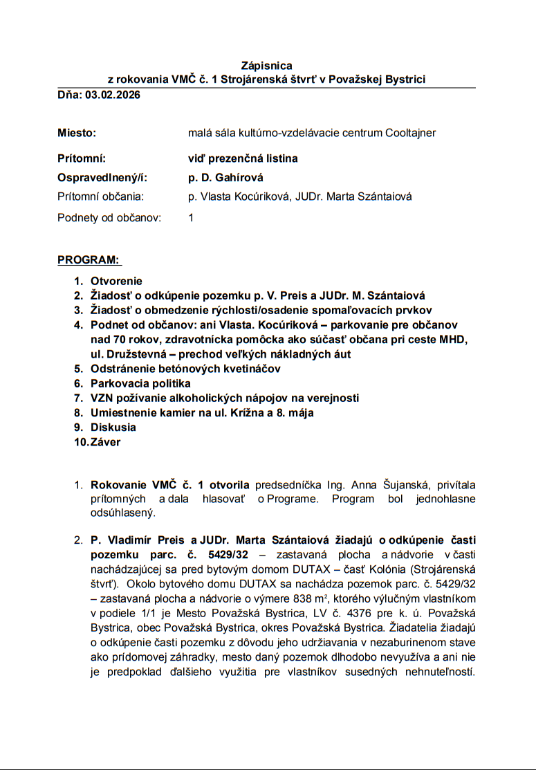 Srdečne Vás pozývame na zasadnutie VMČ č. 1 Strojárenská štvrť, ktoré sa bude konať dňa: