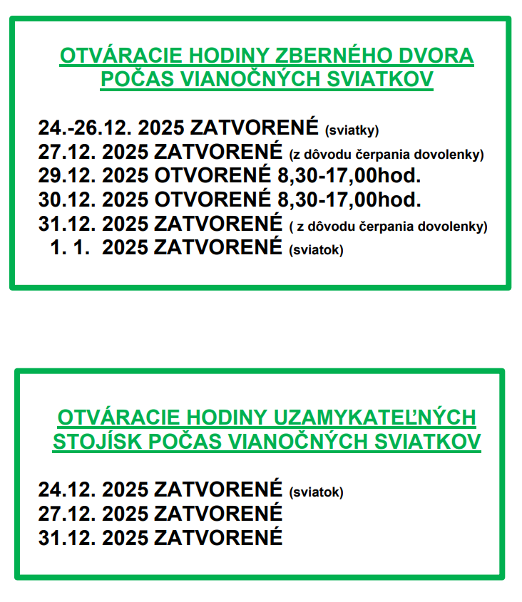Na základe obdržaných informácií z radnice Vám prinášame harmonogram vývozu odpadov počas vianočných a novoročných sviatkov.