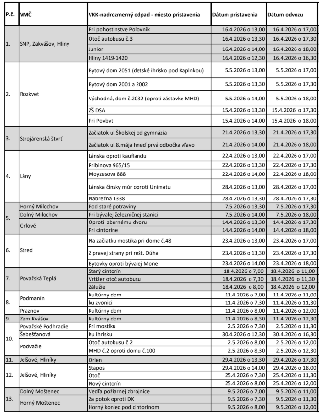 z radnice sme obdržali harmonogram pristavovania veľkokapacitných kontajnerov na odpad počas tohtoročnej jari. Prosíme vás, venujte zvýšenú pozornosť dátumom a časom pristavenia, ako aj informáciám, čo do kontajnerov patrí a čo nie. Vopred vám aj v mene radnice ďakujeme za spoluprácu. Členovia VMČ